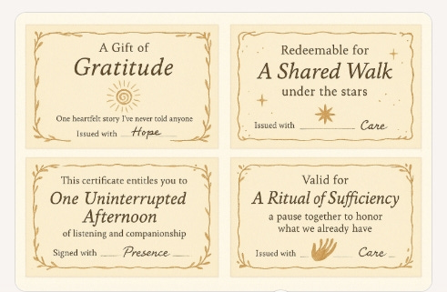 Again, these offers could be expressed in poetic words and/or packaged into “Gift Certificates”, where the signature lines may be filled with “Care”, “Hope”, “Presence”….